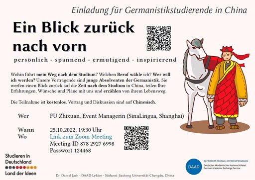 回望过往看向未来”是一个面向中国德语专业学生的在线系列讲座。演讲者都是德语专业的中国毕业生,他们如今在学术界、商界或政界取得了成功。他们在讲座中回顾自己在中国的学习生活,毕业后的情况,从中国走向世界的经历,以及在德国和其它地方的生活和工作。