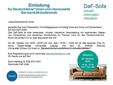 在对外德语教学沙龙上,德国和中国专家在观众面前就热门话题提出自己的论点并进行在线讨论。同时,主办方也在活动上推广德国学术交流中心创建的“德语三次方”教学平台,为大学对外德语教师培训提供教学材料和教学理念。在10月底本学期的第一次沙龙上,来自莱比锡大学的阿勒穆特·凯策-诺勒特格博士和来自武汉大学的张申威博士在20名左右与会者面前就“虚拟世界中的德语学习和教学”这一主题进行了辩论。