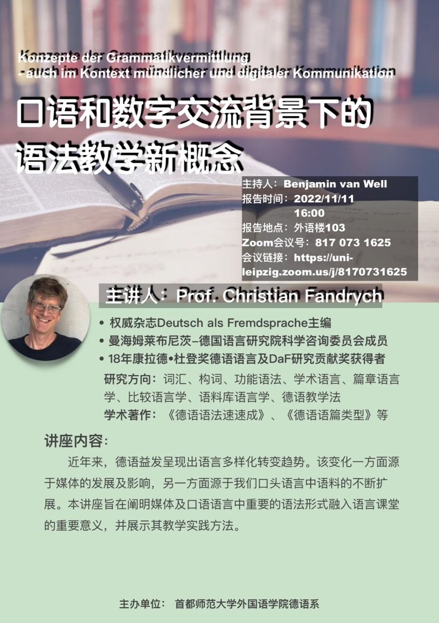 11月11日,首都师范大学DAAD讲师组织的系列讲座由《对外德语教学》主编克里斯提安·范特里希教授主讲。近年来,德语益发呈现出语言多样化的趋势。该变化一方面源于媒体的发展,另一方面源于我们口语语料库的不断扩展。克里斯提安·范特里希教授在其讲座上主张在课堂上介绍媒体及口语的语言运用中出现的重要的语法形式,并通过实例展示了其教学实践方法。