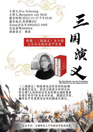 《三国演义》的故事比以往任何时侯都更具现实意义。但是它的语言和形式如何呈现?如何以及为何要将这部经典著作进行译介?经过多年努力将本书译为德语的德国汉学家、翻译家尹芳夏11月17日在其讲座中对这些问题进行了探讨。