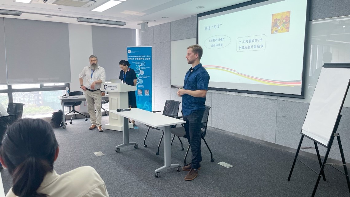 Associate Professor Zhao Qian von der Beijing Foreign Studies University (BFSU) und Professor Patrick Kühnel (Li Ke), Dozent für Deutsch an der BFSU und DAAD-Lektor, hielten auf Grundlage ihrer langjährigen Erfahrung und der engen Zusammenarbeit vertiefende Vorträge zu den beiden Hauptthemen „interkulturelle Anpassung“ und „praktisches Leben“ in Deutschland. Ausgehend von den kulturellen Unterschieden zwischen China und dem Westen erörterten sie eingehend die Probleme, die im Prozess der kulturellen Austausches auftreten können, und leiteten die Geförderten an, in Gruppendiskussionen Lösungen für ausgewählte Szenarien zu finden. Darüber hinaus gaben sie praktische Ratschläge zu bestimmten Szenarien des täglichen Lebens in Deutschland, wie z. B. Einkaufen, Reisen, Anmieten einer Wohnung, Arztbesuch usw., um den Geförderten die Eingewöhnung im Voraus zu erleichtern.