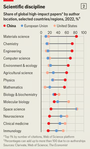 Laut The Economist ist all dies auf drei Faktoren zurückzuführen: Finanzierung, Personal und technische Ausrüstung. Erstens investiert China massiv in Forschung und Entwicklung (FuE). Zahlen aus dem Jahr 2021 zeigen, dass Chinas Ausgaben für FuE zwar noch hinter denen der USA liegen (668 Mrd. USD ggü. 806 Mrd. USD, kaufkraftbereinigt), die Ausgaben für universitäre und staatliche FuE aber schon die der USA überholt haben. Gelder fließen vor allem in strategische Forschungsschwerpunkte wie KI, Halbleiter, Genetik und Quantentechnologie. Zweitens kehren seit den späten 2000er Jahren immer mehr im Ausland tätige chinesische Wissenschaftler in ihr Heimatland zurück. Neben Pull-Faktoren wie Programmen, die besonders qualifizierten Wissenschaftlern Zuschüsse versprechen und sie beim Aufbau eigener Laboratorien unterstützen, gibt es auch Push-Faktoren. Drittens verfügen Chinas Universitäten und Forschungseinrichtungen über eine technische Ausstattung, die laut eines ehemaligen Forschers am MIT „einfach eindrucksvoller und umfassender“ als in den USA sind, und die mit jedem Jahr weiterwächst. Chinas kürzlich vollendete unbemannte Expedition zur Mondrückseite veranschaulichte unmissverständlich den hohen Technologiestandard des Landes.
