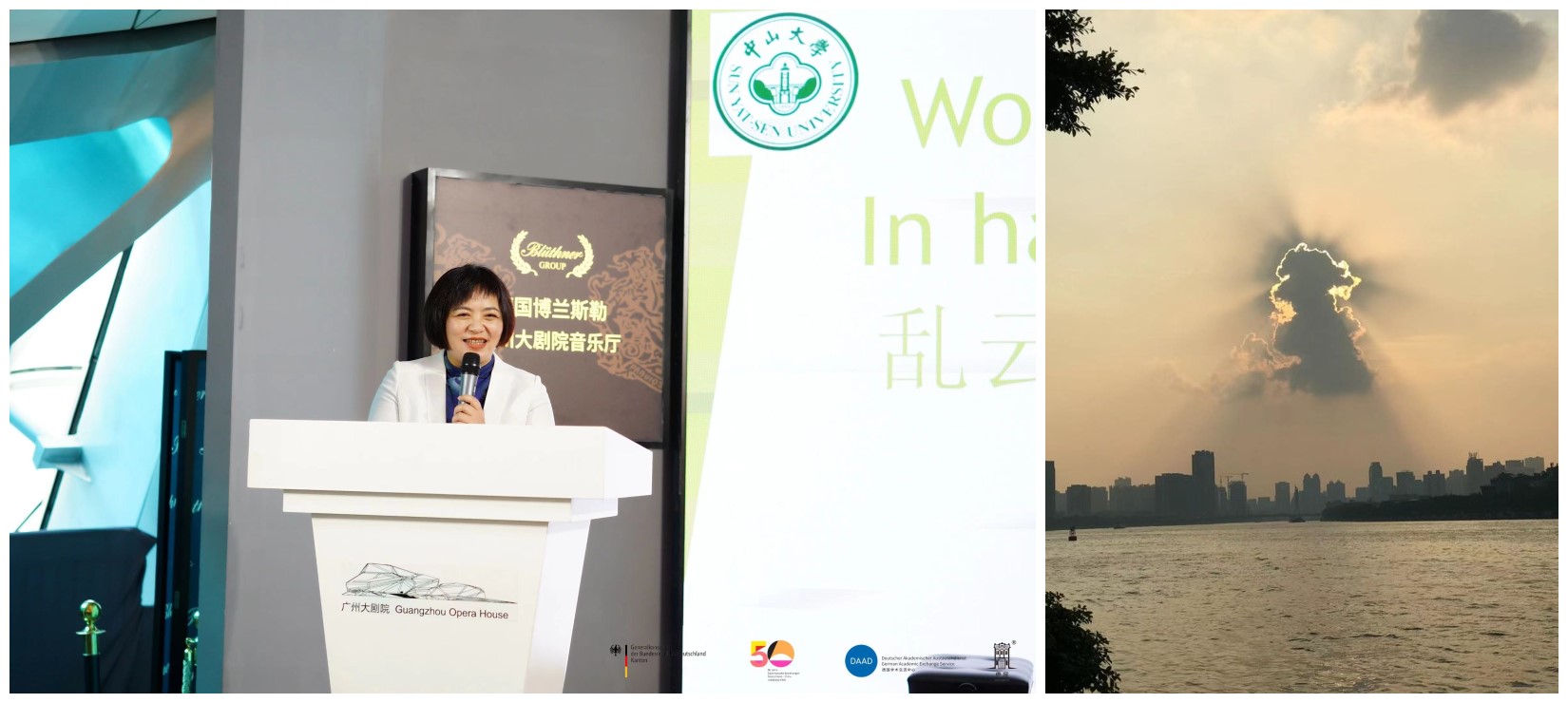 Im Vortrag von Professorin Yang Jin zeigte eine Fülle privater Fotoaufnahmen: Im Wolkengebilde entdeckte sie die Deutschlandkarte über dem Perlfluss schwebend – eine Vision für die weitere Zusammenarbeit von Deutschland und China.© DAAD