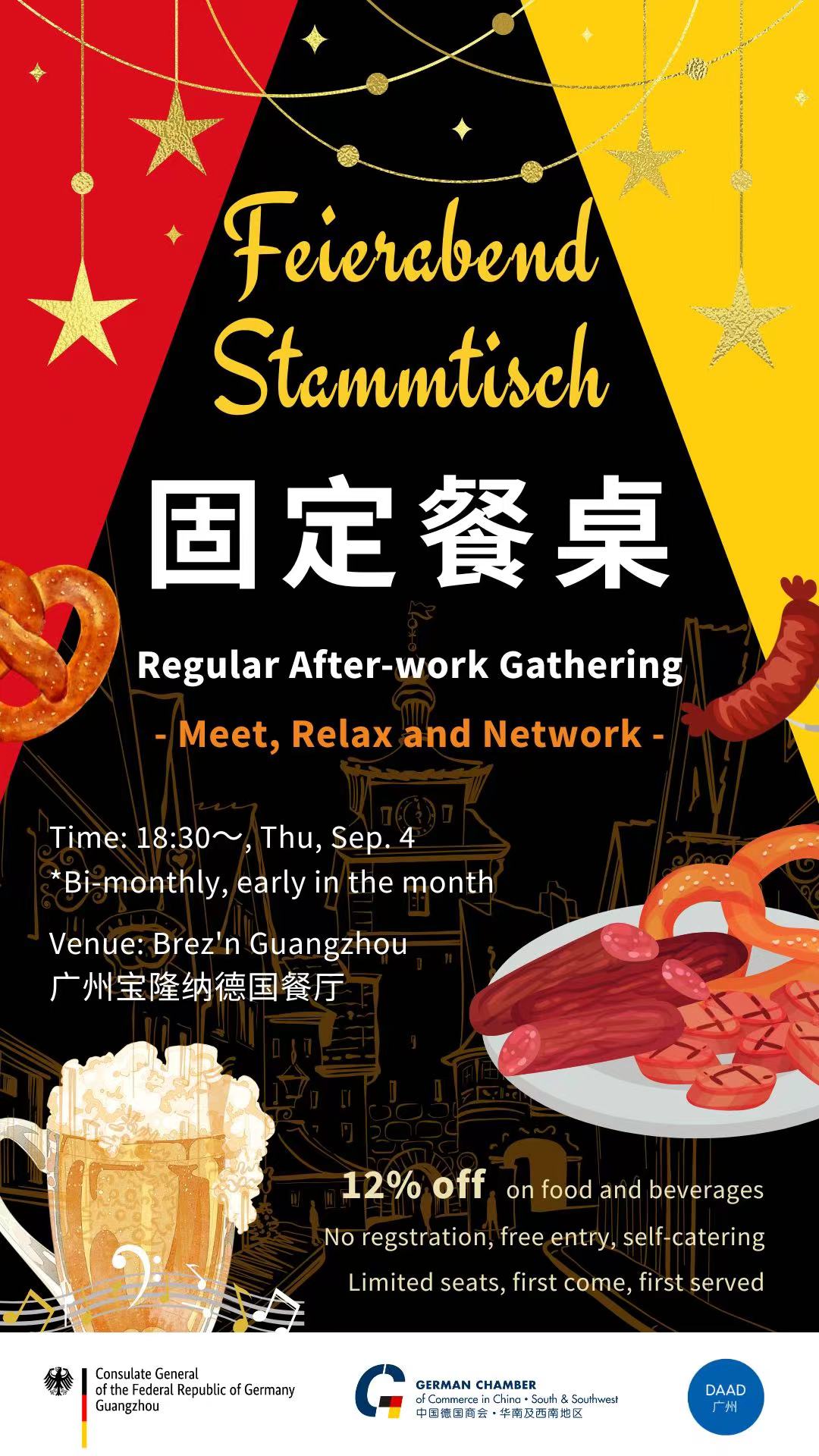 Together with the Consulate General of Germany in Guangzhou and German Chamber of Commerce in China·South & Southwest, we are bringing this traditional German event back to Guangzhou as a regular bi-monthly after-work gathering for the Sino-German community: alumni who studied in Germany, Chamber members, Germans, and friends of German language and culture!