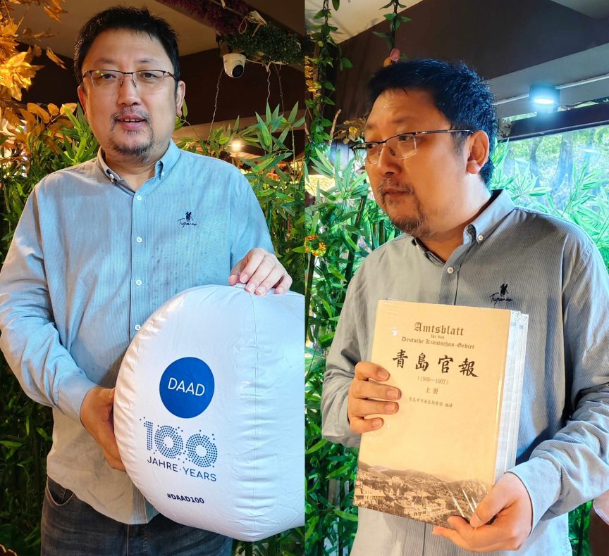 Der DAAD-Alumnus Zhu Yijie von der Qingdao-Universität ist seit langem mit der Geschichte der Stadt Qingdao und den deutsch-chinesischen Beziehungen im 19. und frühen 20. Jahrhundert befasst. Zu seinen wissenschaftlichen Veröffentlichungen gehören mehrere Übersetzungen zu diesen Themen. Bei der Veranstaltung übergab er diese zwei Werke als Dankeschön an den DAAD für dessen Unterstützung vor vielen Jahren: Anweisung für eine Reise in Qingdao und Umgebung (1904) , Amtsblatt für das deutsche Kiautschou-Gebiet 1900-1907 (8 Bände) sowie die Tagungsbände internationaler Symposien zur deutsch-chinesischen Beziehungsgeschichte und zur Geschichte Qingdaos.