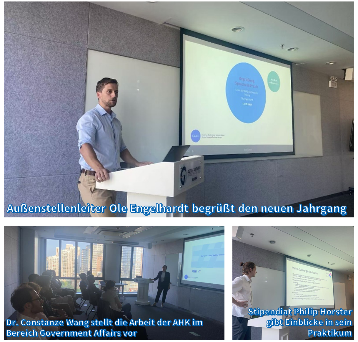 Der DAAD organisierte für den neuen, 29. Jahrgang nach ihrer Ankunft eine Begrüßungsveranstaltung in kleiner Runde. Neben der Begrüßung durch den Außenstellenleiter Ole Engelhardt, gab es auch Vorträge und Q&A-Sessions mit Dr. Constanze Wang von der Auslandshandelskammer (AHK) und Mitarbeitern der Deutschen Botschaft Peking. Philip Horster aus dem vorherigen Jahrgang stellte sein Praktikum bei Agora Energiewende vor. Abschließend ließen wir den Abend mit einem gemeinsamen Abendessen ausklingen.