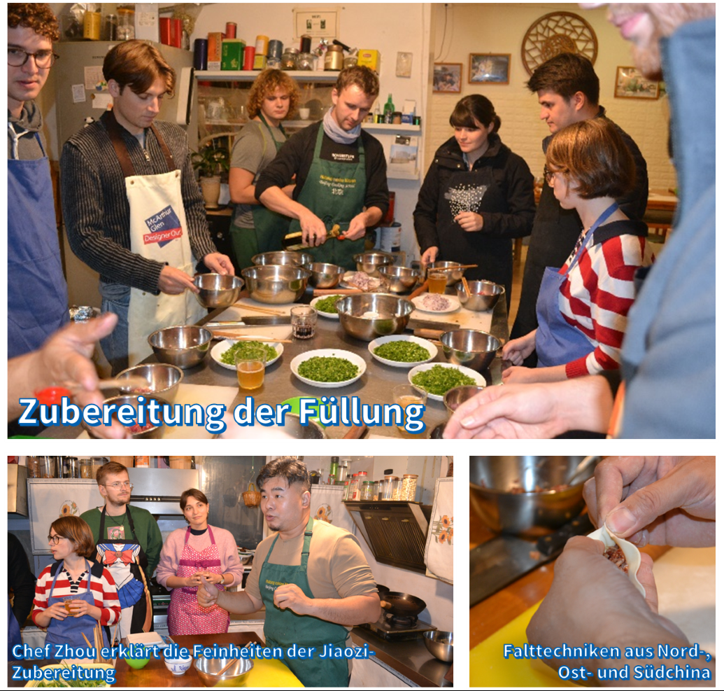 Abends fuhren wir zurück in die Innenstadt, um gemeinsam den Abend ausklingen zu lassen. Dies taten wir, indem wir unter der Obhut von Chef Zhou Chao die hohe Kunst der chinesischen Teigtaschen (Jiaozi) lernten. Teig und Füllung zubereiten, die richtige Technik beim Ausrollen des Teigs, und verschiedene Techniken des Faltens und der Zubereitung der Teigtaschen: Alle Punkte wurden gut verständlich von Chef Zhou erklärt, sodass wir am Ende gemeinsam einen Berg an selbstgemachten Jiaozi verspeisen durften.
