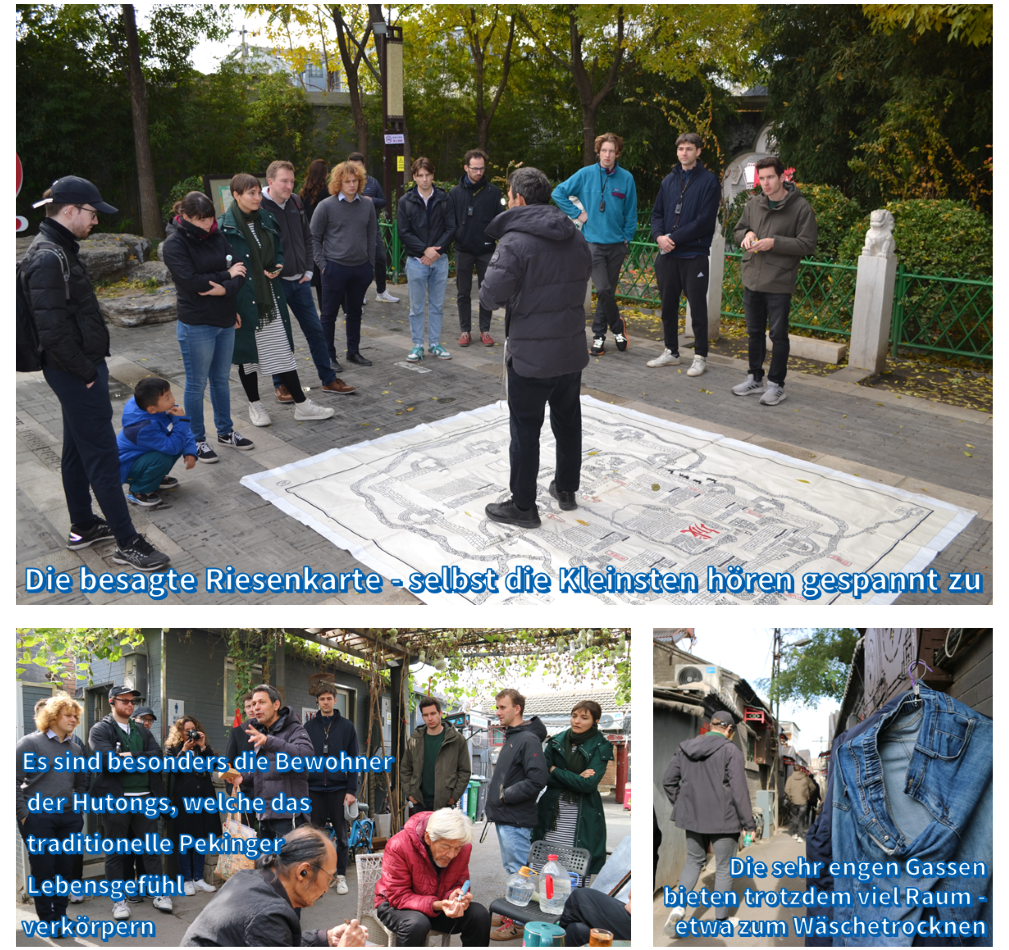 Am dritten und letzten Tag trafen sich die Geförderten und Alumni bei Beijing Postcards. Dort gab uns Peking-Veteran und Stadtführer Lars zunächst eine Einführung in die Geschichte der Hutongs. Das sind die engen Gassen, welche das Stadtbild und -Gefühl der Pekinger Innenstadt heute immer noch prägen. Während wir daraufhin durch die Hutongs streiften, zeigte Lars an allerhand Karten – die Größte musste 2 mal 3 Meter messen – die verschiedenen Merkmale und historischen Gegebenheiten der Hutongs auf. Zum Abschluss trafen wir uns im Café von Frau Wang. Wir hörten gespannt ihrer Familiengeschichte zu: Als langjährige Bewohner dieses Hutongs haben sie und ihre Familie das Auf und Ab der chinesischen Geschichte hautnah miterlebt. Alles in allem wurde uns eine äußerst gelungene Stadtführung mit spannenden Einblicken geboten!