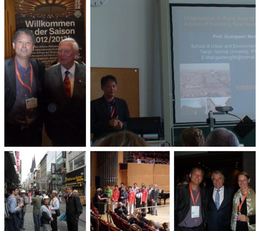 从左至右依次是: 孟教授和时任德国图宾根与发展中国家科学合作研究所所长的Hohnhotz教授在2012科隆国际地理大会上、 孟教授在该大会上发言、 大会期间的实地考察、大会上的国际地理奥林匹克发奖仪式、孟教授和科隆市长以及大会组委会主席合影© DAAD