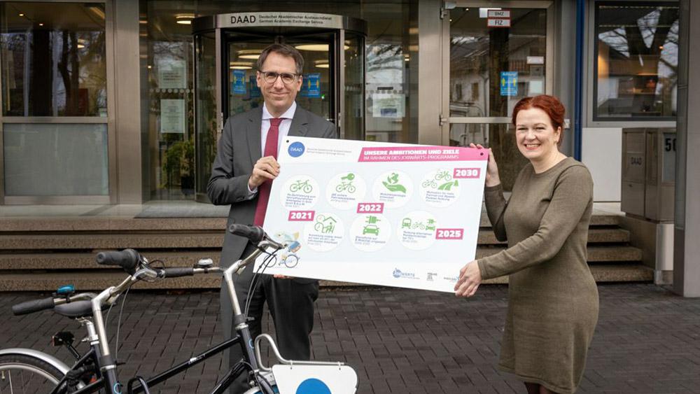 作为“促进就业”项目的一部分,波恩市长卡佳·多纳(Katja Dörner)于2022年2月向DAAD秘书长凯·西克斯博士赠与了海报 “DAAD促进可持续通勤交通的7个目标和抱负”的海报© DAAD/Michael Jordan