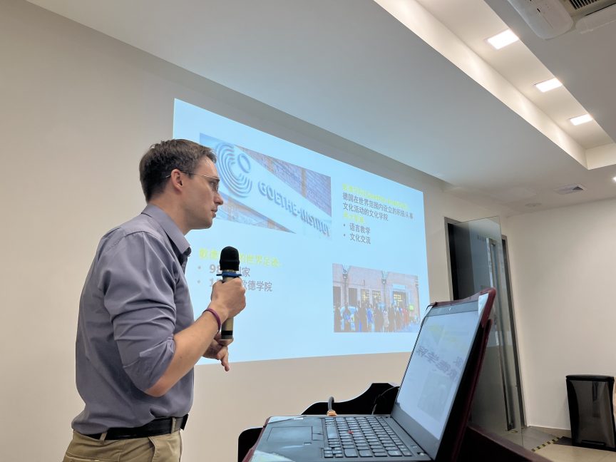 随后,广财歌德学院语言中心的德方主任Steffen Hanisch先生与陈良娟老师共同介绍了该中心所开设的多种级别与形式的德语语言课程及德语等级考试安排,全面展示了中心在德语教学与评估方面的丰富资源与服务。